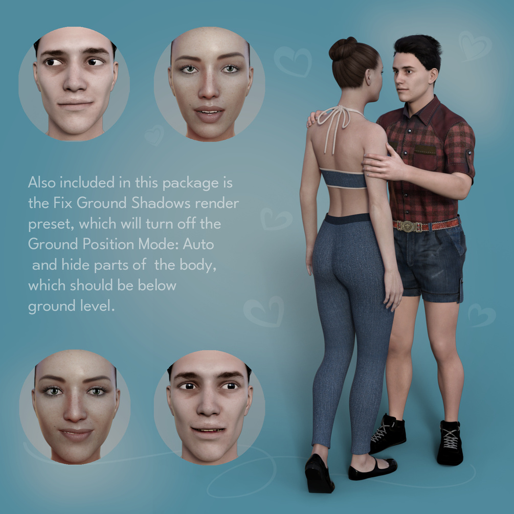 This product also contains a Shadow Ground Fix render preset with turns off Ground Position Mode: Auto and hides parts of the body, which are supposed to be below the ground in the final render.